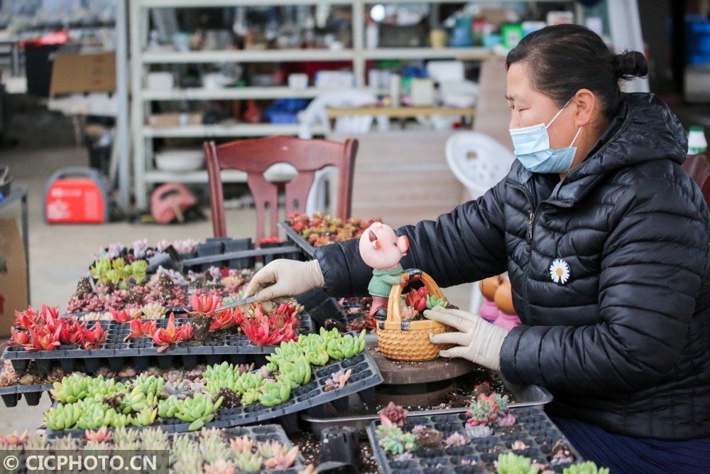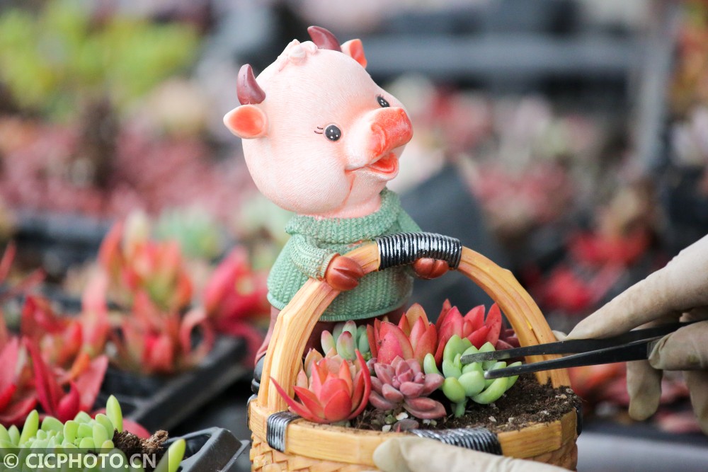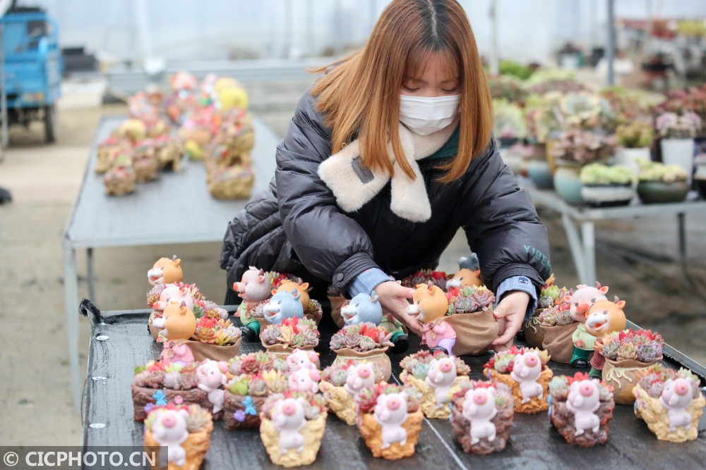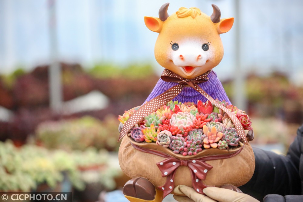 ↑2021年1月16日,在江苏省如皋市磨头镇华夏花卉批发市场,花匠在装饰生肖牛多肉植物主题盆栽。CICPHOTO/徐慧 摄