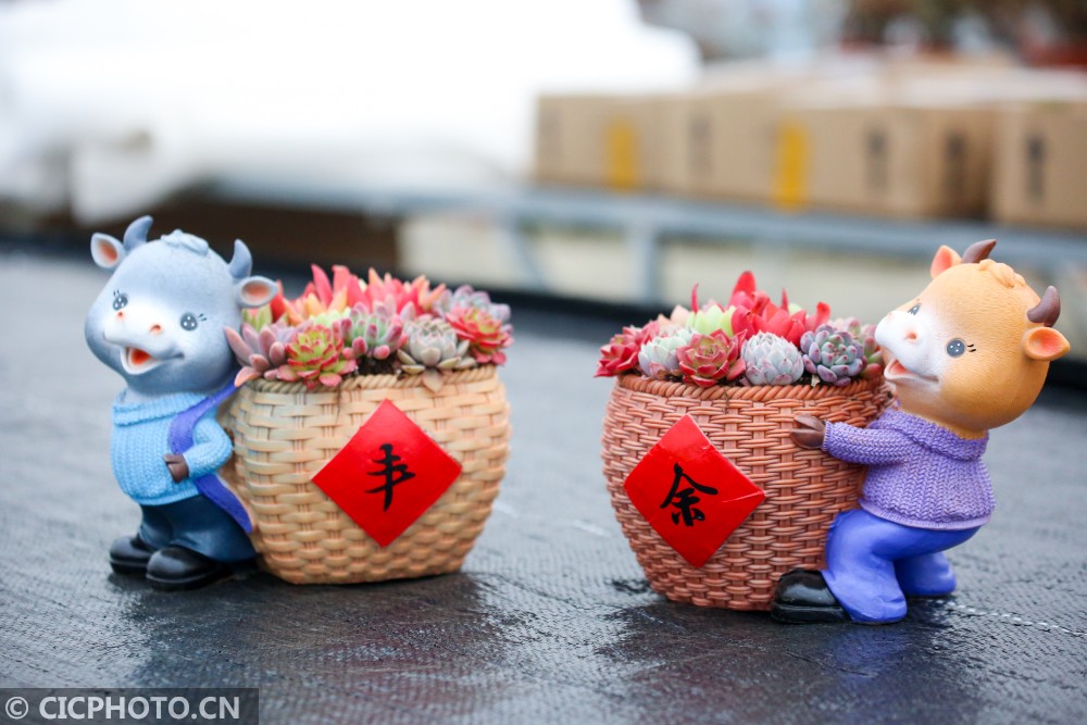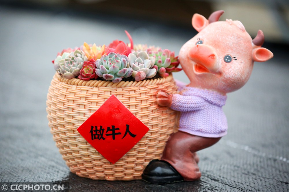 ↑2021年1月16日在江苏省如皋市磨头镇华夏花卉批发市场拍摄的的生肖牛多肉植物主题盆栽。CICPHOTO/徐慧 摄
