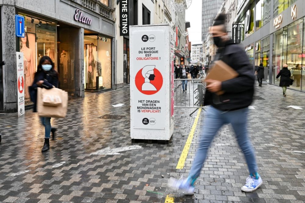 2020年12月1日,在比利时布鲁塞尔,人们走过一处商业街内提示佩戴口罩的标识。(新华社记者张铖摄)