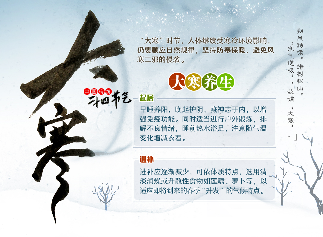 罗澍伟提醒,“大寒”时节,人体继续受寒冷环境影响,仍要顺应自然规律,坚持防寒保暖,避免风寒二邪的侵袭。起居方面,早睡养阳,晚起护阴,藏神志于内,以增强免疫功能。同时适当进行户外锻炼,排解不良情绪,睡前热水浴足,注意随气温变化增减衣着。进补则应逐渐减少,可依体质特点,选用清淡润燥或升散性食物,如莲藕、萝卜等,以适应即将到来的春季“升发”的气候特点。