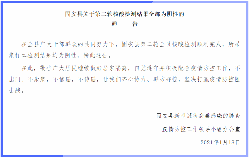 据“固安发布”微信公众号18日消息,河北固安县新型冠状病毒感染的肺炎疫情防控工作领导小组通报,在全县广大干部群众的共同努力下,固安县第二轮全员核酸检测顺利完成,所采集样本检测结果均为阴性。