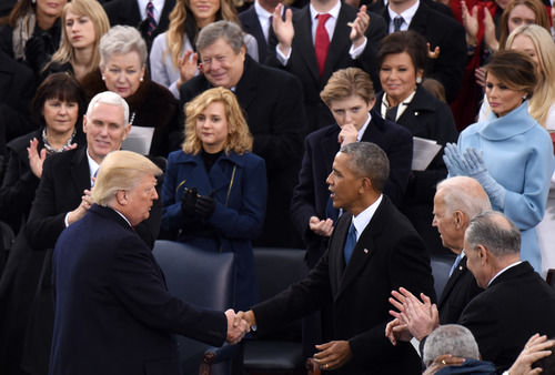 2017年1月20日,在美国首都华盛顿国会山,特朗普(前左)发表就职演说后与前任总统奥巴马握手。奥巴马身旁是担任其副总统的拜登。新华社记者殷博古摄