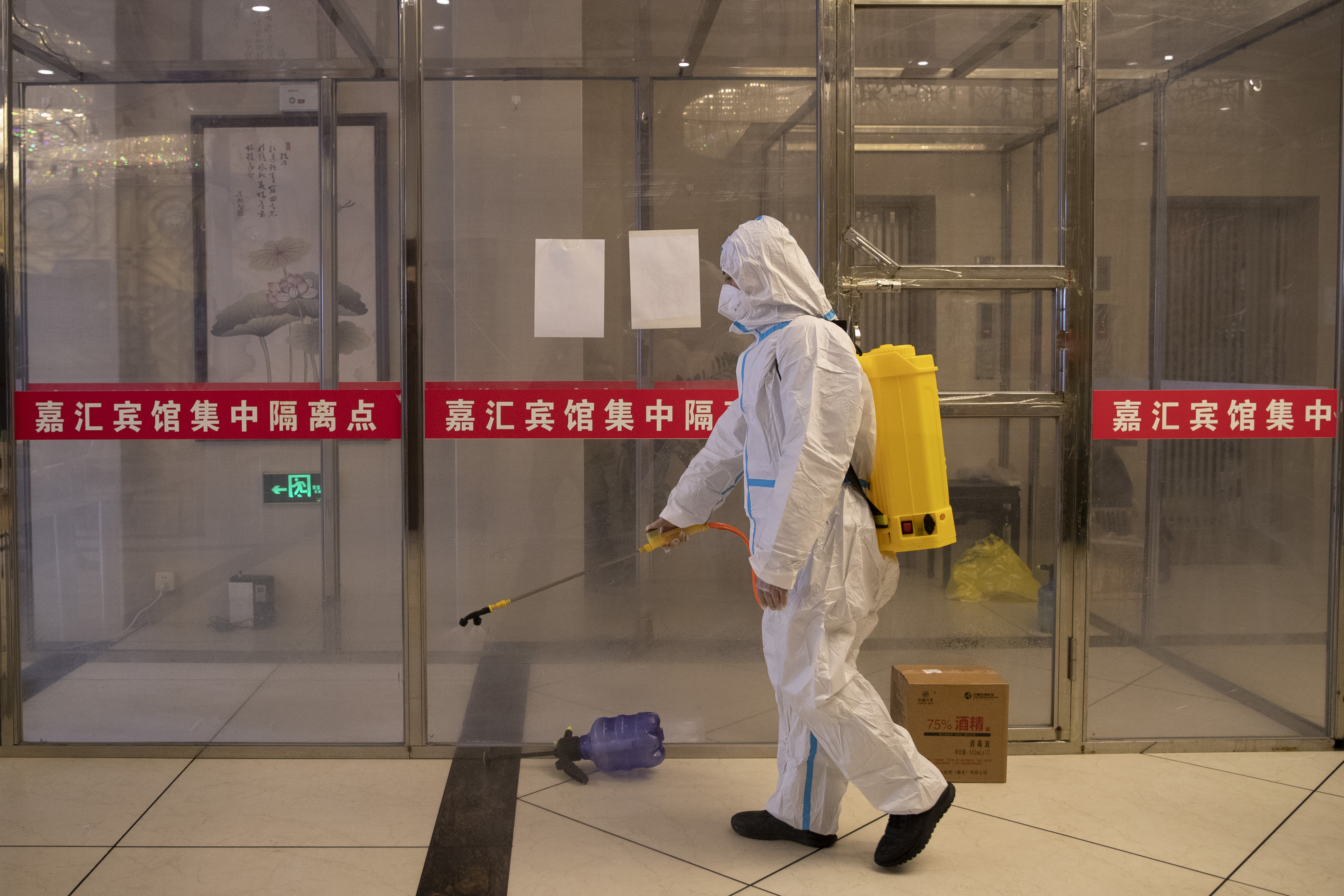 1月15日,隔离点医护人员在黑龙江省绥化市望奎县嘉汇酒店集中隔离点进行消杀作业。(张涛 摄)
