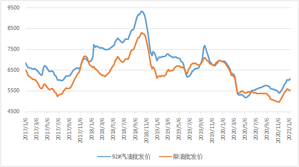 图表:国内汽、柴油批发价格周度均价走势图(单位:元/吨)