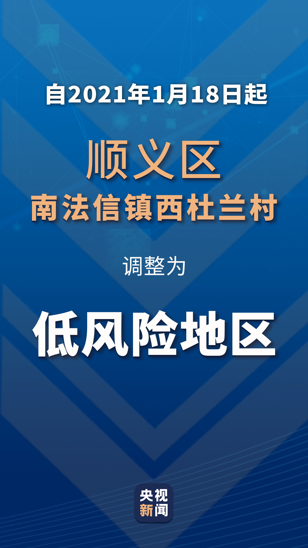 顺义区南法信镇西杜兰村近14天内无新增确诊病例或聚集性疫情,经市疾控中心评估,按照《北京市新冠肺炎疫情风险分级标准》,自2021年1月18日起,该地区调整为低风险地区。