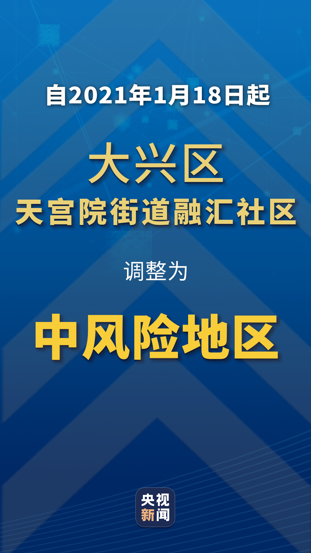 北京市疾控中心副主任刘晓峰发布通报,1月17日,北京市报告2例本地确诊病例,经市疾控中心评估,按照《北京市新冠肺炎疫情风险分级标准》,自2021年1月18日起,新增大兴区天宫院街道融汇社区为中风险地区。