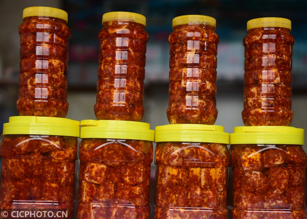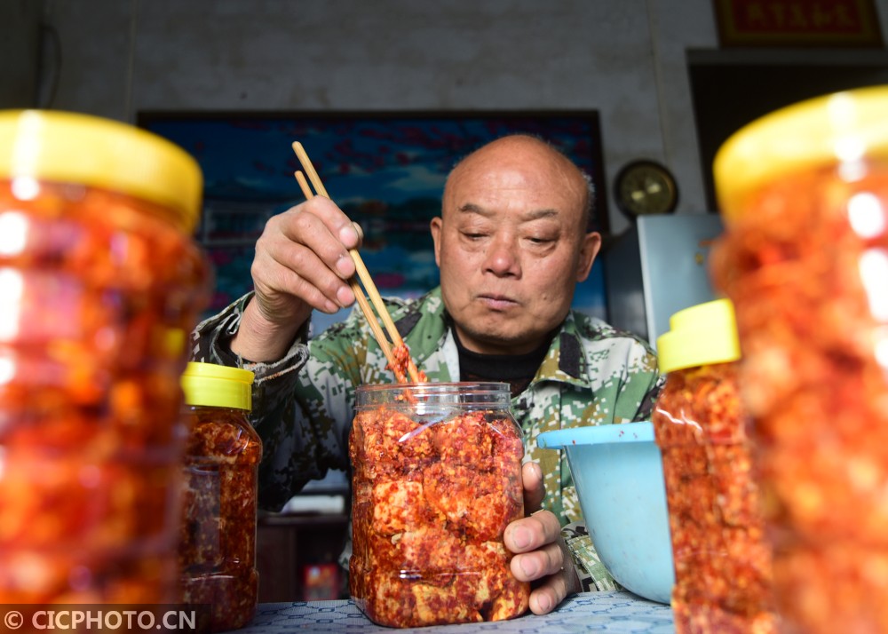 ↑2021年1月17日,湖南省郴州市嘉禾县晋屏镇邓家村,村民将“霉豆腐”沾上辣椒、五香、食盐等配料装瓶。CICPHOTO/黄春涛 摄