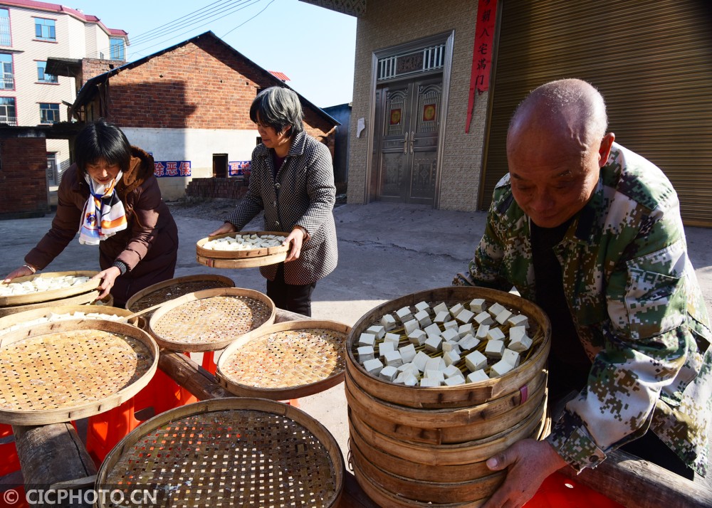 ↑2021年1月17日,湖南省郴州市嘉禾县晋屏镇邓家村,村民在晾晒豆腐。CICPHOTO/黄春涛 摄