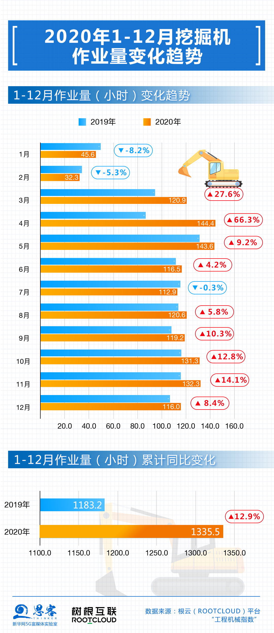 从三一重工孵化的工业互联网平台——树根平台的“工程机械指数”实时数据看,2020年全年挖掘机累计工作时间超越去年同期,同比上涨12.9%。与此同时,四季度数据尤其令人欣喜,10月、11月、12月三个月份从销量到工作时间,均保持较为高速和平稳的增长。树根互联联合创始人、CEO贺东东说,“挖掘机指数”不仅反映经济活力,还清晰展现中国基建的火热图景。