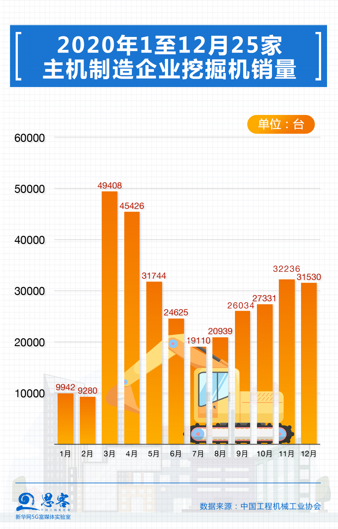挖掘机销量素有中国经济“温度计”之称。据中国工程机械工业协会统计,2020年12月纳入统计的25家挖掘机制造企业共销售各类挖掘机31530台,同比增长56.4%;全年共销售挖掘机327605台,同比增长39%。从百万亿里程碑和挖掘机销量增长的背后,我们看到了怎样的中国经济活力与图景?