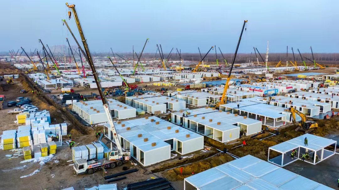 超过1000套集成房屋于1月16日吊装完毕,施工人员开始安装门窗和空调、热水器、整体卫浴等设施。