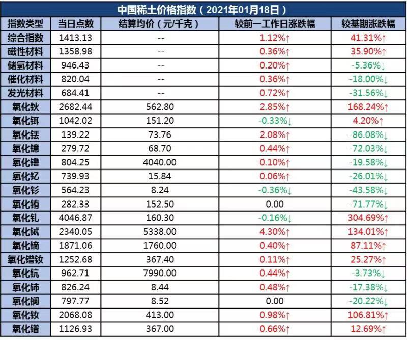 其中,氧化钬、氧化铥、氧化镱、氧化镥、氧化钇、氧化铽、氧化镝、氧化镨钕、氧化钪、氧化铈、氧化钕、氧化镨单品价格指数分别较前一工作日上涨,氧化铒、氧化钐、氧化钆单品价格指数分别较前一工作日下跌,氧化铕、氧化镧单品价格指数分别与前一工作日持平。