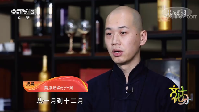 苗族蜡染设计师 成昊:因为说到花嘛,我们中国的传统文化里有十二花神。从一月到十二月,每个月都有它的月令花神。比如说,我们的一月是梅花,二月是杏花,三月是桃花,四月牡丹,五月石榴,六月荷花,七月玉簪,八月桂花,九月菊花,十月芙蓉,十一月山茶,十二月水仙。我们按照每个月开的这个花的色彩,去把今年的纯蓝白色的蜡染,(变得)有了一些跳跃的鲜艳的花朵的颜色。
