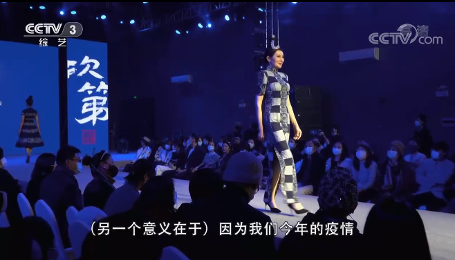 苗族蜡染设计师 成昊:开场的时候,我们有28位各种不同年龄段的模特集体出场。我们从色彩、灯光、视觉、听觉上都会有一个前期我们在疫情期间的一个状态。人的表情都是很阴暗的、沉重的,我们用了大面积的蓝色,代表着我们压抑的状态,所有的模特不是以美为主,他们都戴着口罩,这个就是我们对待疫情的一个态度。然后呢,中间有两件非常重要的衣服,我们的主题叫“非常时刻”,是以当时我们国家对待疫情的一个态度设计的两件衣服。