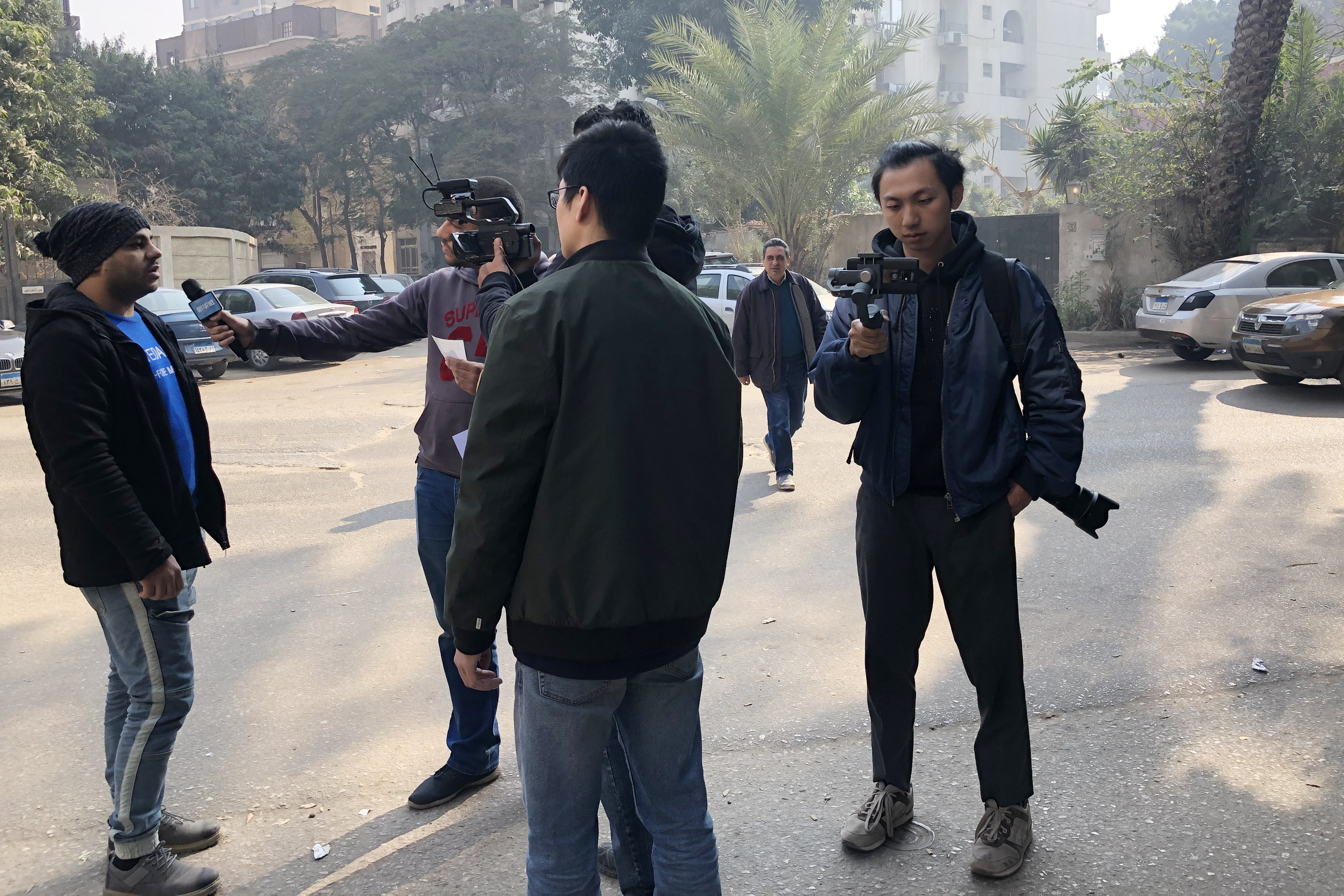 ▲新华社记者邬惠我(右一)在埃及首都开罗采访。