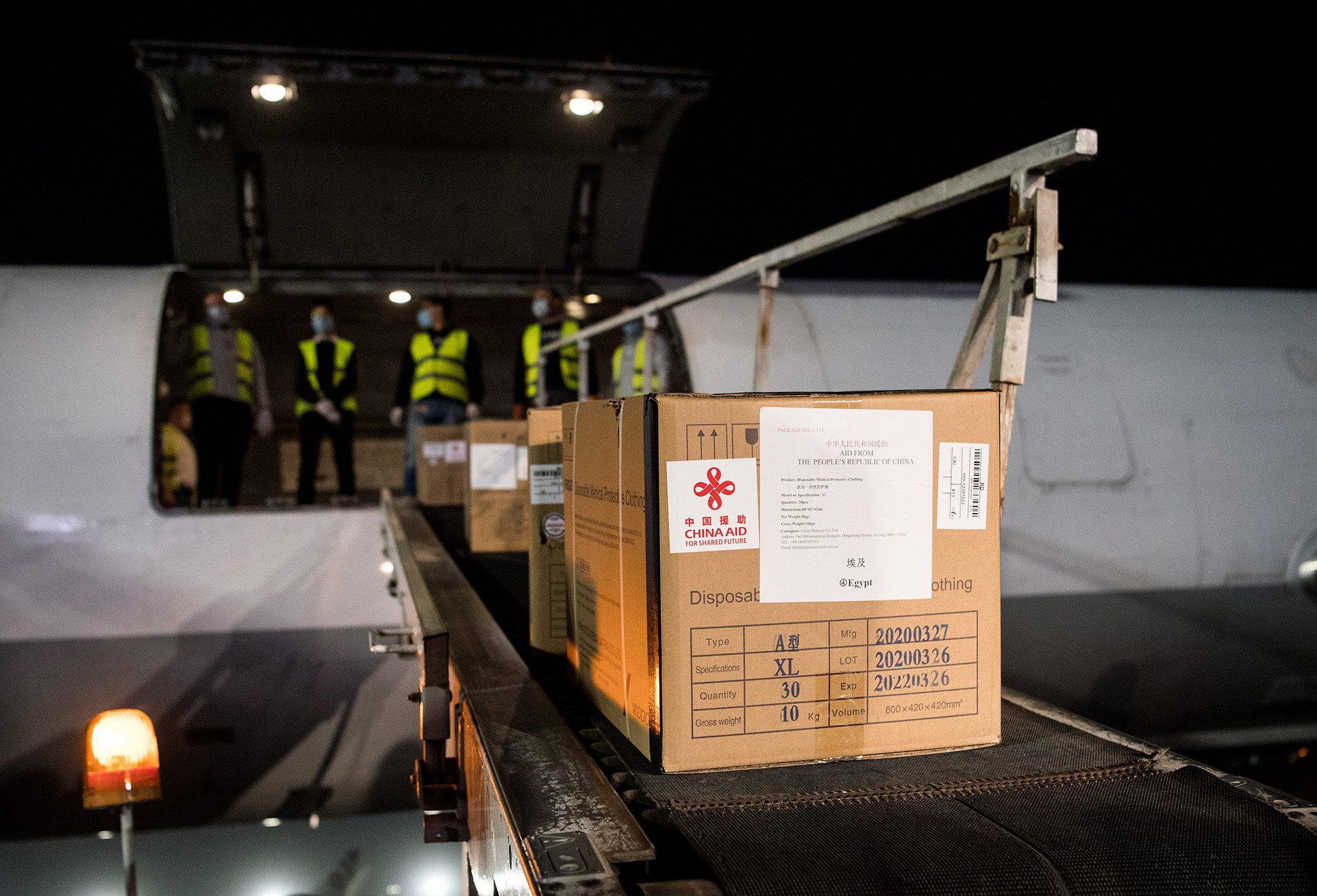▲2020年4月16日,中国政府援助埃及首批抗疫物资运抵开罗,抗疫物资包括2万个N95口罩、1万套防护服和1万人份检测试剂。