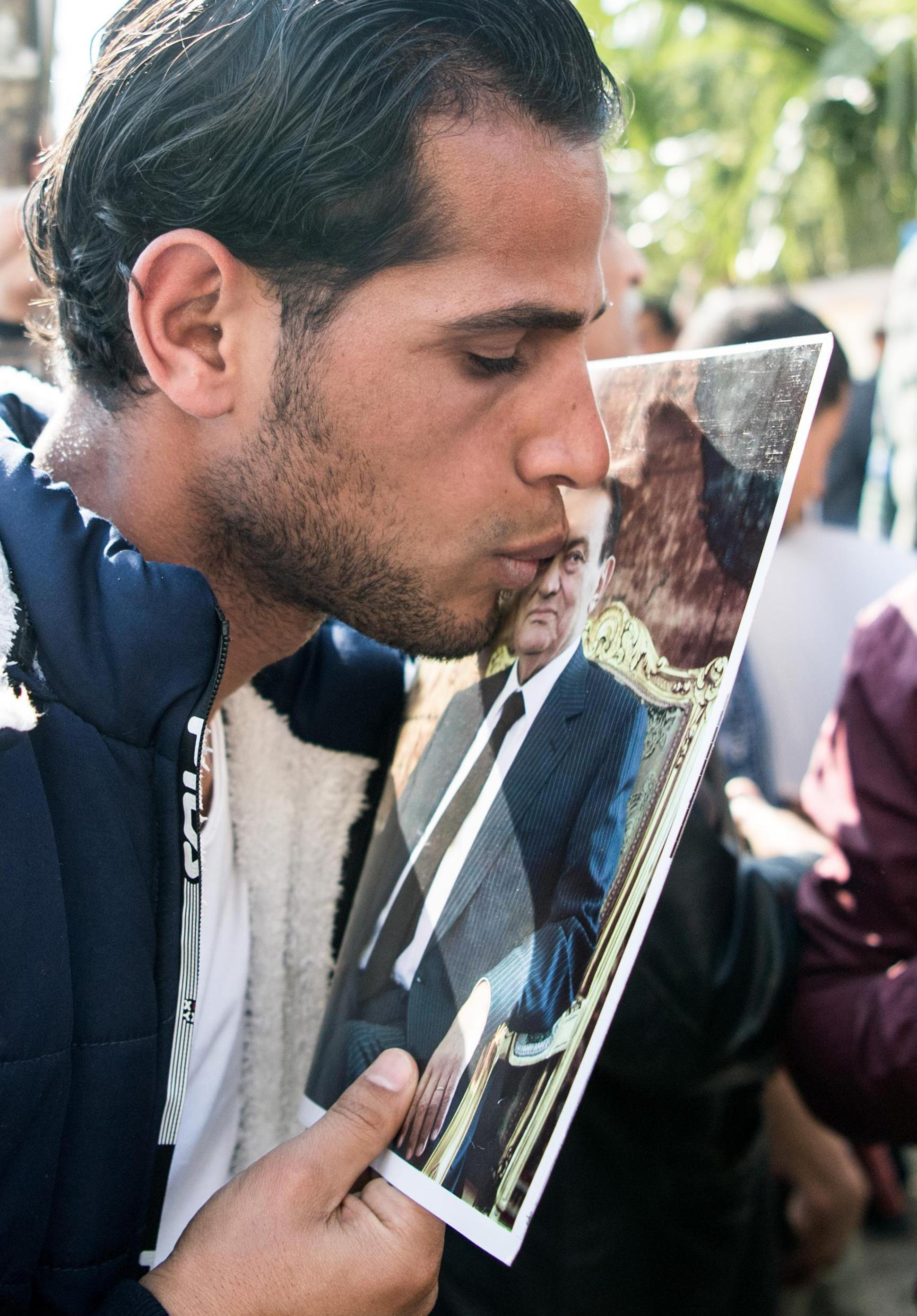 ▲2020年2月26日,埃及首都开罗,一名男子亲吻埃及前总统穆巴拉克的照片。