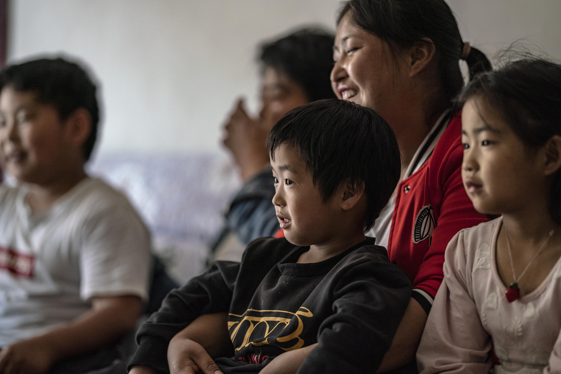 ▲2020年4月15日,李小波的妻子阿花妹在托坪村五湖易地扶贫搬迁安置点的家中与孩子们一起看电视。