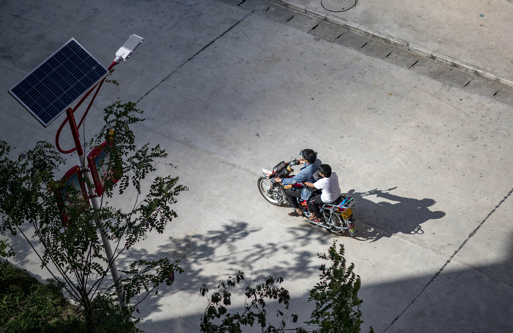 ▲2020年4月15日,李小波骑着摩托车带着孩子们在托坪村五湖易地扶贫搬迁安置点院里转一转。