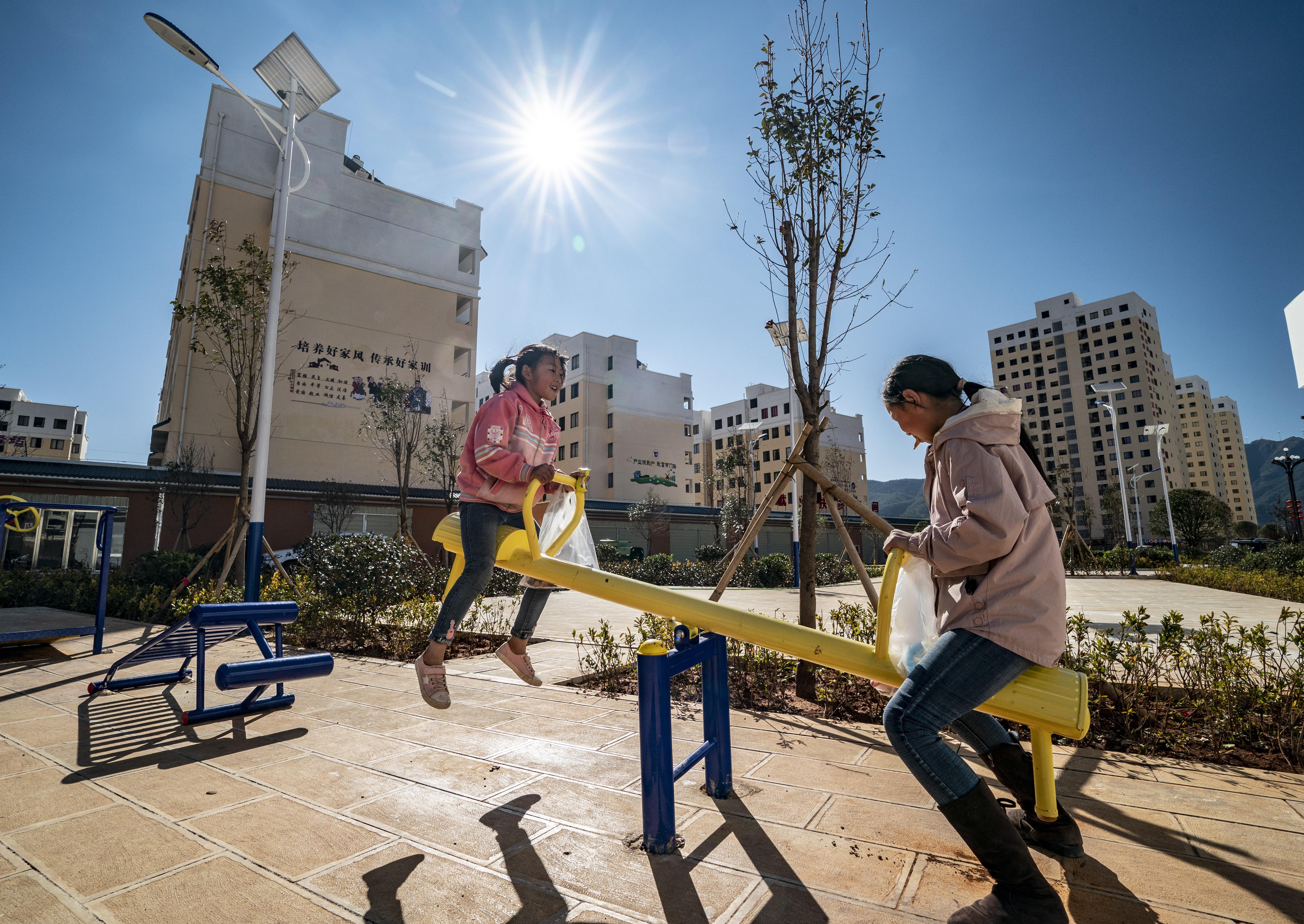 ▲2020年1月23日,在云南省会泽县新城易地扶贫搬迁安置小区里,8岁的张玉(左)与朋友一起玩跷跷板。