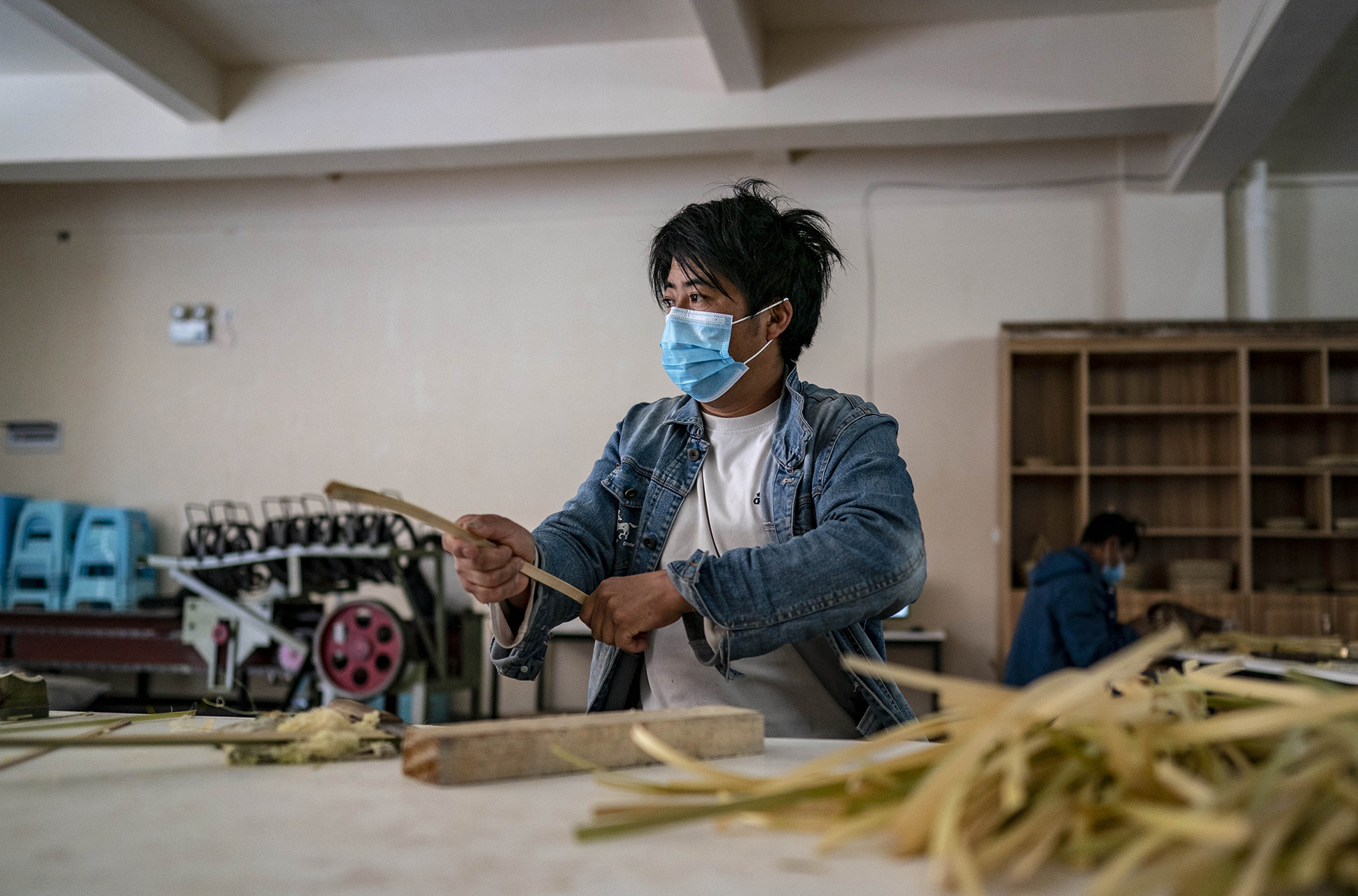 ▲2020年4月15日,李小波在山下的扶贫车间学习竹编。
