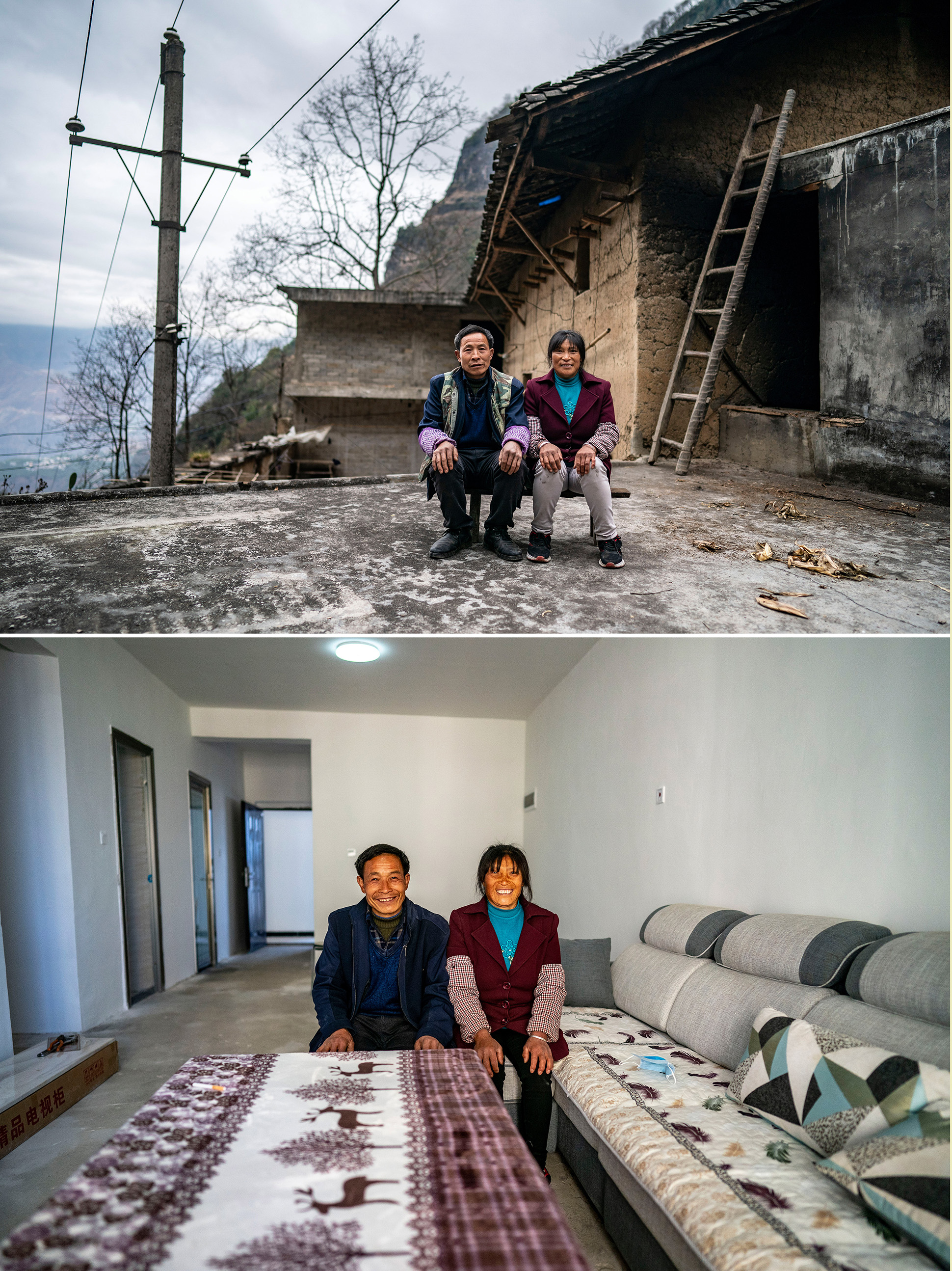 ▲拼版照片:上图,2020年3月14日,王大香和丈夫晏付高在生活了二十多年的老屋前合影;下图,2020年3月15日,夫妻俩在新居内合影。