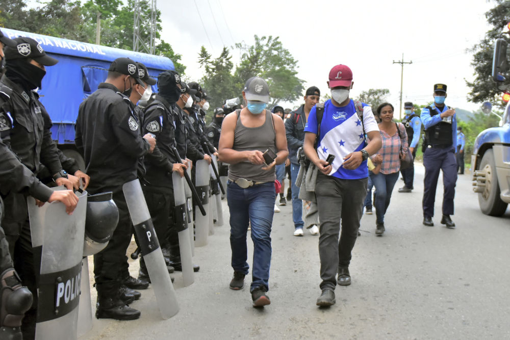 1月15日,在洪都拉斯北部城市科夫拉迪亚,中美洲民众走过当地警方面前。(新华社发)