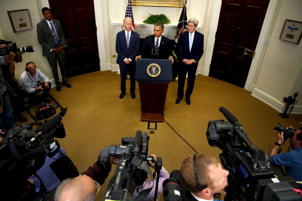 2015年11月6日,时任美国总统奥巴马(中)、时任副总统拜登(中左)在华盛顿白宫出席记者会。奥巴马当天以项目不符合美国国家利益为由,否决了连接美国、加拿大两国的“拱心石XL”输油管道项目。(新华社/路透)