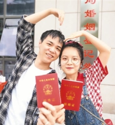 2020年5月20日,江苏淮安,一对青年申领结婚证后合影。赵启瑞摄(人民视觉)