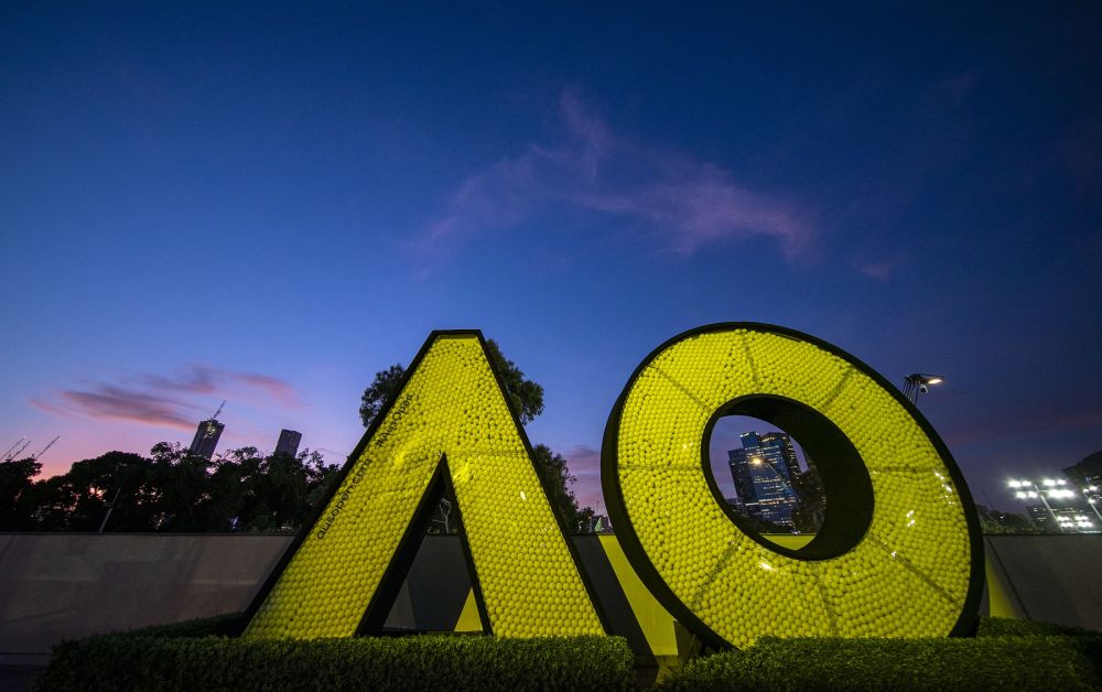 2020年1月28日,在澳网赛场外,晚霞下的AO(澳网)标志。(新华社记者白雪飞摄)
