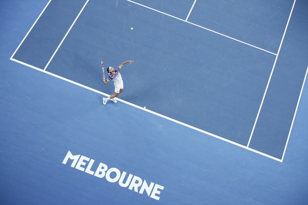 2020年2月2日,在澳大利亚墨尔本进行的澳大利亚网球公开赛男子单打决赛中,奥地利选手蒂姆迎战塞尔维亚选手焦科维奇。图为蒂姆在比赛中发球。(新华社记者白雪飞摄)