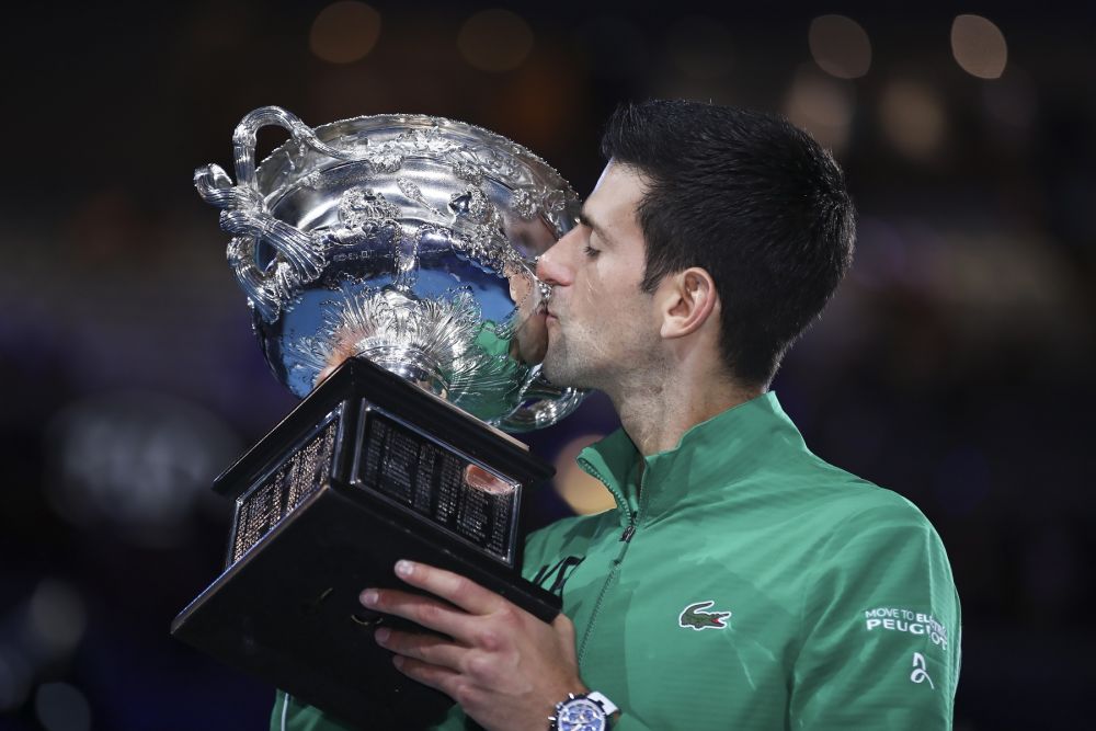 2020年2月2日,在澳大利亚墨尔本进行的澳大利亚网球公开赛男子单打决赛中,塞尔维亚选手焦科维奇以3比2战胜奥地利选手蒂姆,夺得冠军。(新华社记者白雪飞摄)