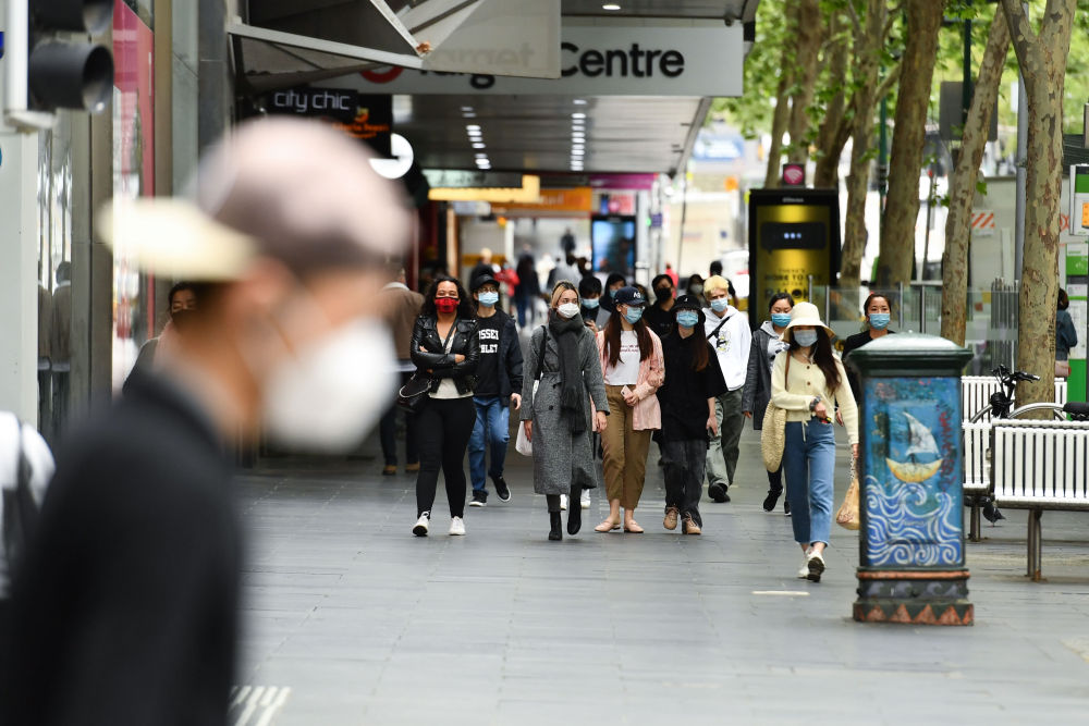 2020年10月19日,市民戴着口罩行走在澳大利亚墨尔本市中心。(新华社发,白雪摄)
