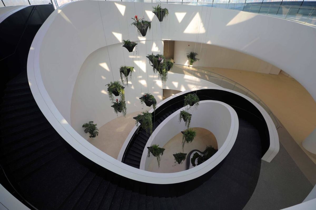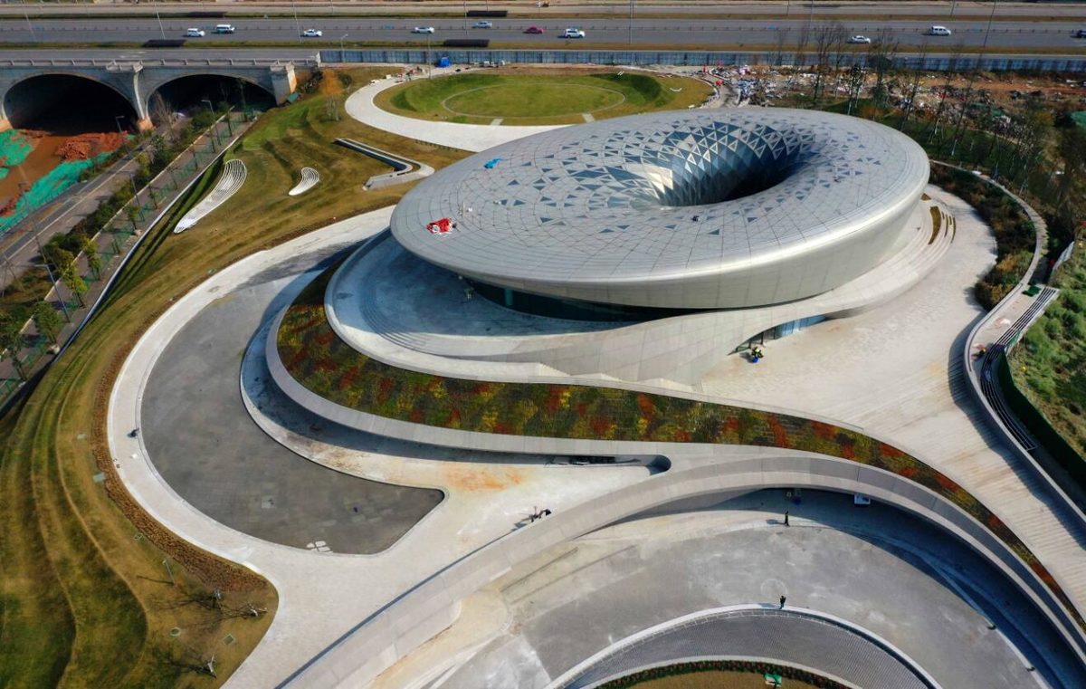 北侧高边坡在国内首次运用参数化设计,多曲面叠浪艺术地形,呈现出绿色叠浪堆坡,与整体建筑浑然一体。