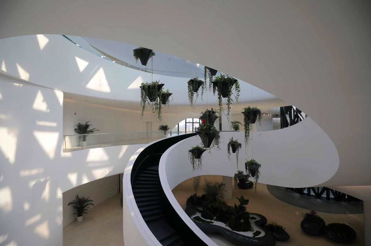 室内展陈精装方面,引进高品质有机磨石地面,通过多种颜色的水磨石做整体弯曲拼接,大大提升了空间层次感,鲜明展现了充满未来感的建筑美学。