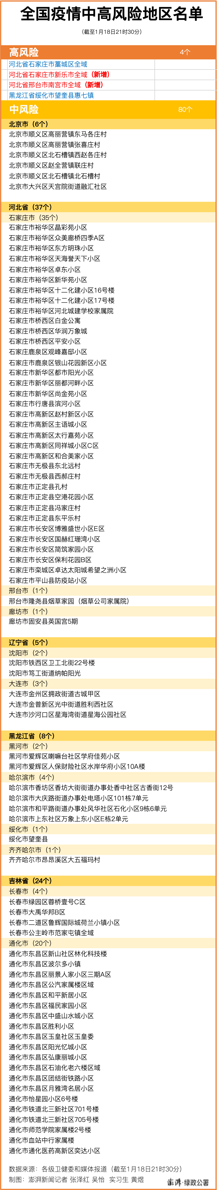 截至1月18日21时30分,目前全国现有4个高风险地区,3个在河北,1个在黑龙江;80个中风险地区,其中6个在北京、37个在河北、5个在辽宁、8个在黑龙江,24个在吉林。