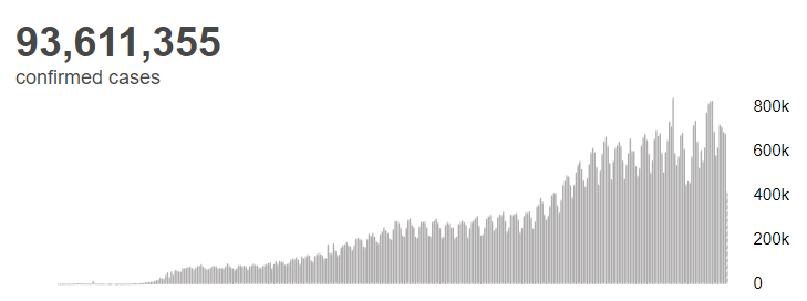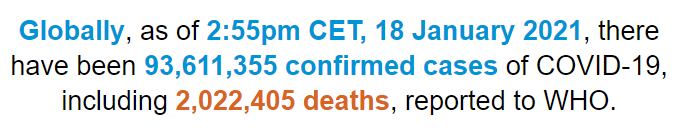 根据世卫组织最新实时统计数据,截至欧洲中部时间1月18日14时55分(北京时间1月18日21时55分),全球累计新冠肺炎确诊病例93611355例,累计死亡病例2022405例。(总台记者 朱赫)