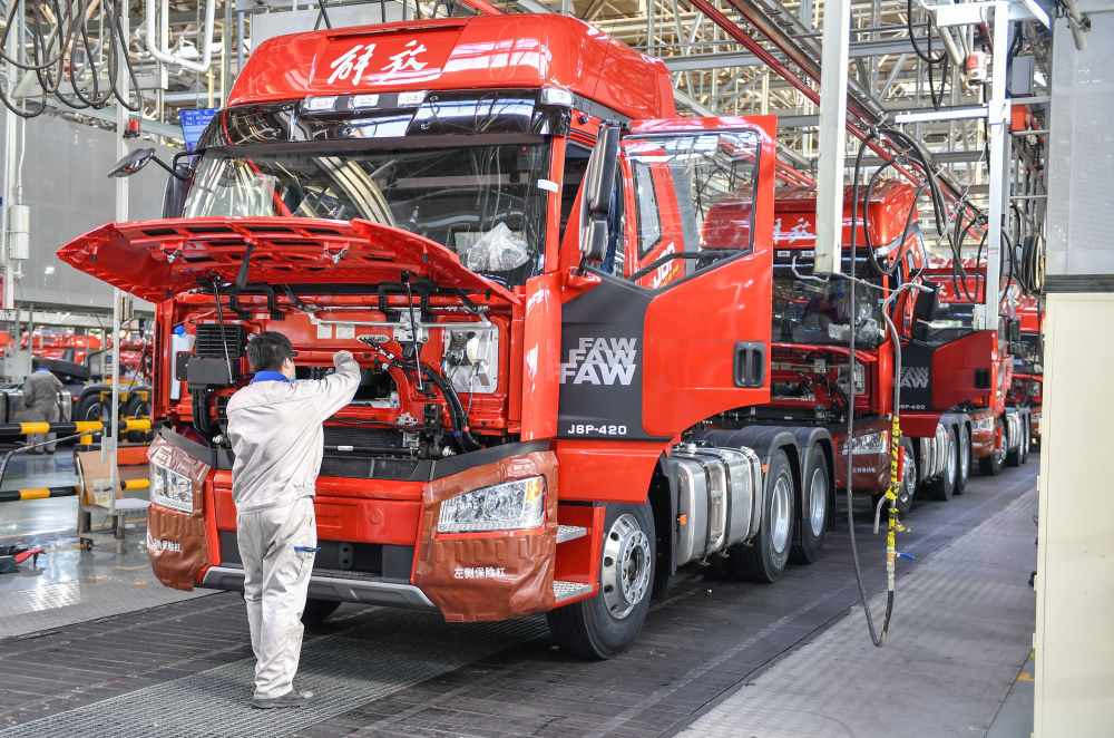 工人在位于长春的一汽解放总装车间装配车辆(2021年1月5日摄)。新华社记者 张楠 摄