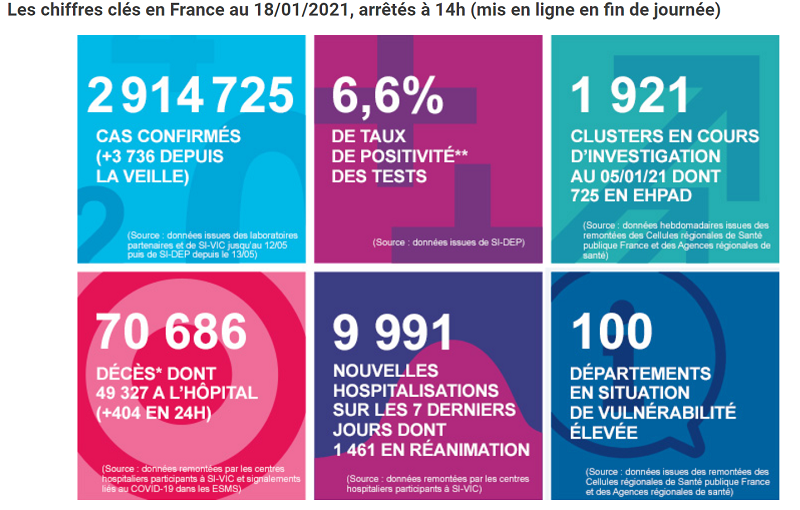法国公共卫生部门1月18日当天公布的数据显示,截至当天下午,法国累计新冠肺炎确诊病例达2914725例,较前一日新增3736例。过去七日,法国平均每日新增新冠阳性病例超过18000人。由于法国周日检测机构不营业,故周一数据均较少。
