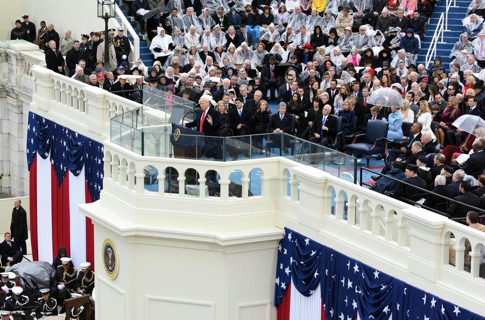 这是2017年1月20日,在美国首都华盛顿国会山,特朗普在美国第45任总统就职典礼上发表讲话。(新华社记者殷博古摄)