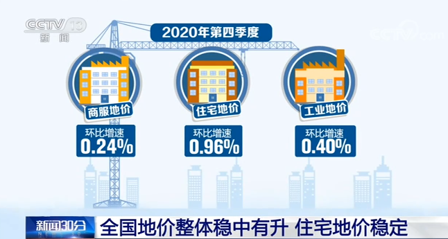 央视网消息:19日上午,自然资源部中国国土勘测规划院发布2020年第四季度全国主要城市地价监测报告。报告显示,全国地价整体稳中趋升,商服、住宅增速持续上升。