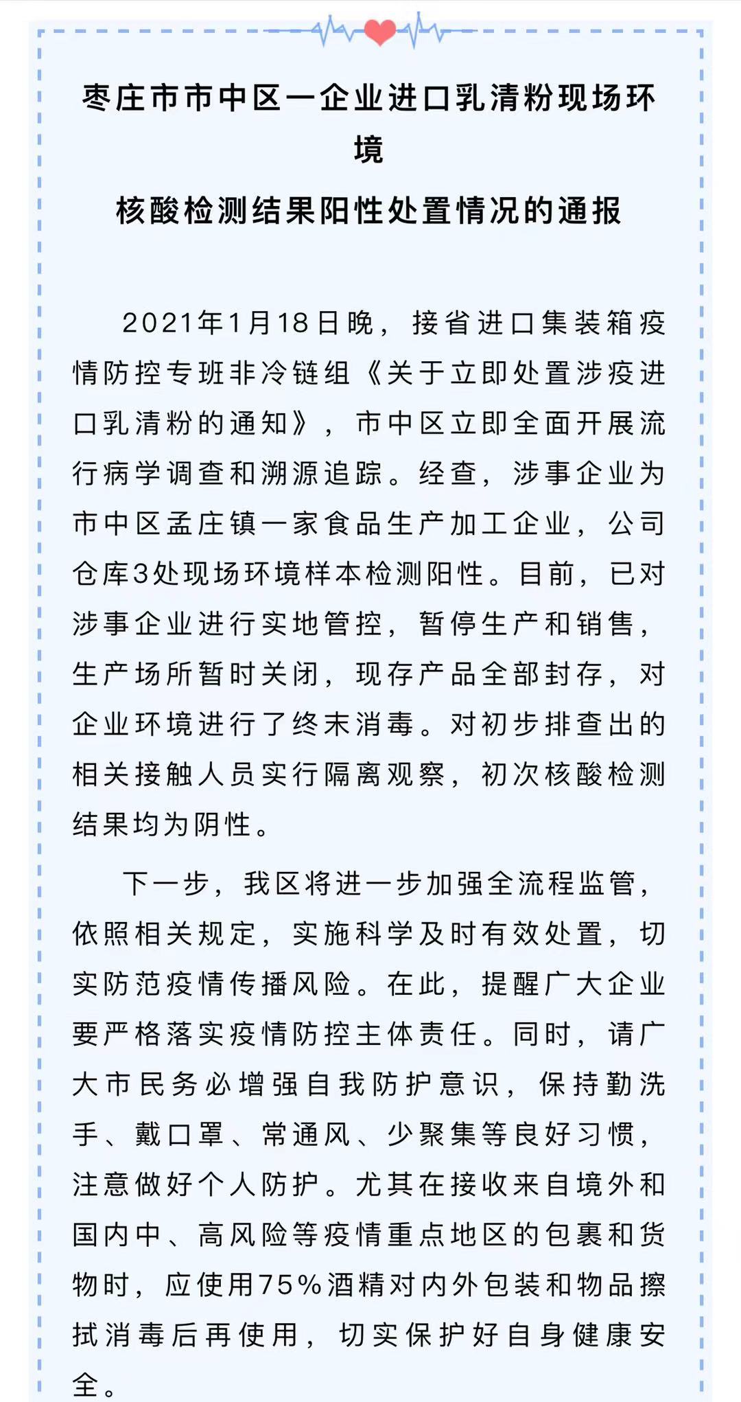 2021年1月18日晚,接山东省进口集装箱疫情防控专班非冷链组《关于立即处置涉疫进口乳清粉的通知》后开展流行病学调查和溯源追踪。经查,涉事企业为市中区孟庄镇一家食品生产加工企业,公司仓库3处现场环境样本检测阳性。目前,已对涉事企业进行实地管控,暂停生产和销售,生产场所暂时关闭,现存产品全部封存,对企业环境进行了终末消毒。对初步排查出的相关接触人员实行隔离观察,初次核酸检测结果均为阴性。