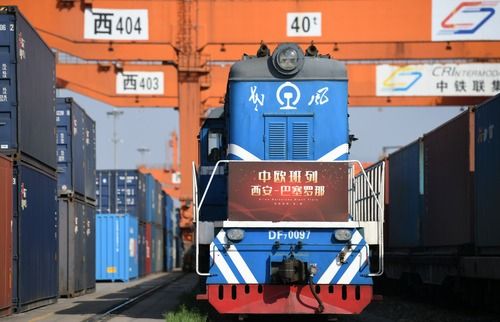 图为西安至巴塞罗那中欧班列在西安市新筑车站等待发车