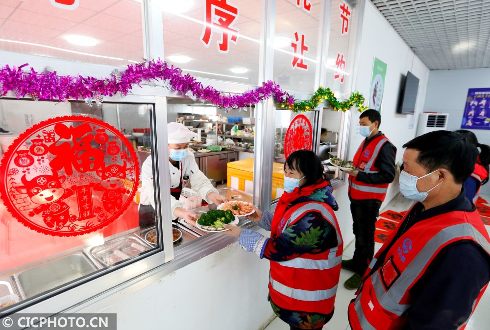 ↑2021年1月17日,在山东省青岛市即墨区,一建筑企业的员工领取午餐。CICPHOTO/梁孝鹏 摄