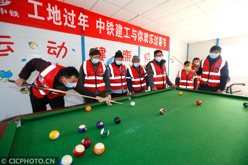 ↑2021年1月17日,在山东省青岛市即墨区,一建筑企业的员工在文娱室打台球。CICPHOTO/梁孝鹏 摄