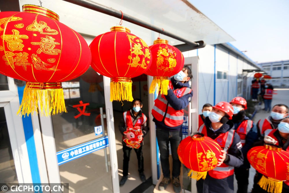 ↑2021年1月17日,在山东省青岛市即墨区,一建筑企业的员工在文娱室一起挂灯笼。CICPHOTO/梁孝鹏 摄