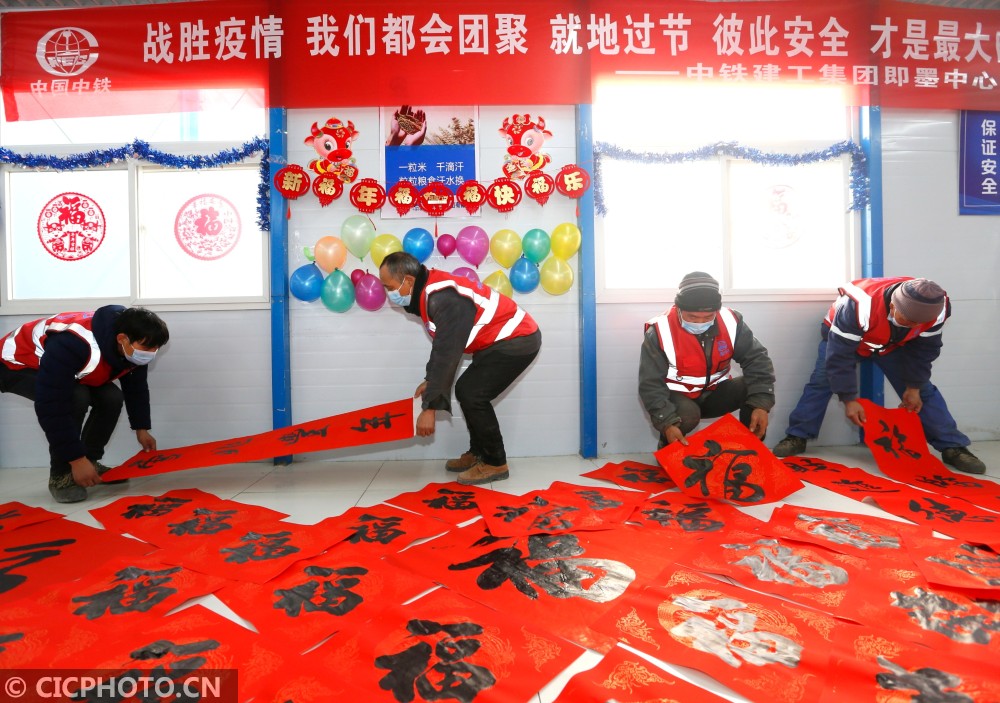 ↑2021年1月17日,在山东省青岛市即墨区,一建筑企业的员工摆放志愿者为他们书写的春联和福字。CICPHOTO/梁孝鹏 摄