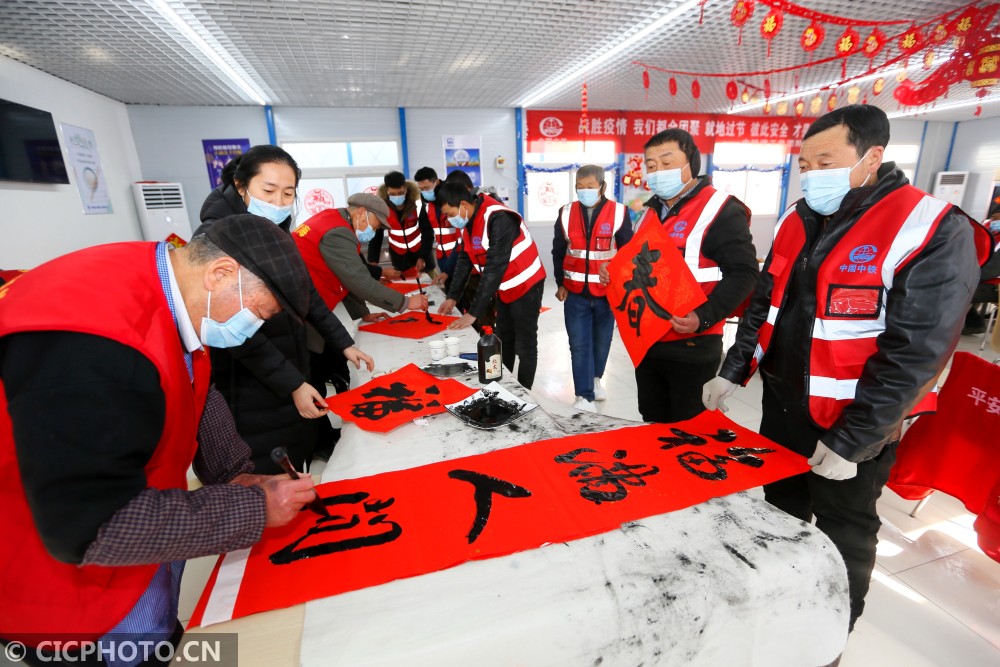 ↑2021年1月17日,在山东省青岛市即墨区,社区志愿者为一建筑企业的员工写春联。CICPHOTO/梁孝鹏 摄