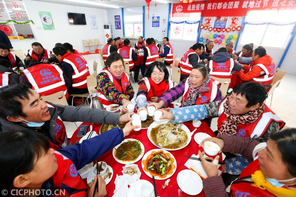 ↑2021年1月17日,在山东省青岛市即墨区,一建筑企业的员工一起吃午餐。CICPHOTO/梁孝鹏 摄