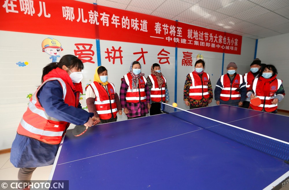 ↑2021年1月17日,在山东省青岛市即墨区,一建筑企业的员工在文娱室打乒乓球。CICPHOTO/梁孝鹏 摄